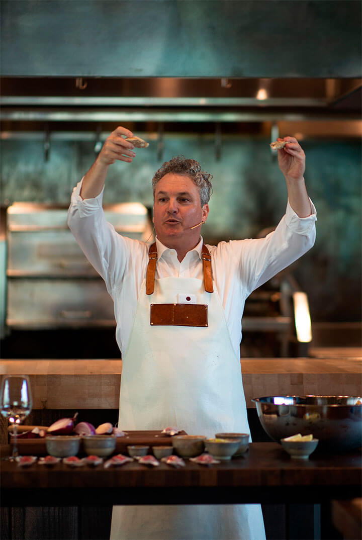 Our roaming mobile oyster shuckers are known as Oyster Girls and Oyster Guys, and they undergo rigorous training to provide guests with an efficient and enjoyable experience. You can find them walking among guests, shucking and serving raw oysters from buckets around their waists. Their presentation provides guests with knowledgeable conversation, impressive skill, and delicious results.